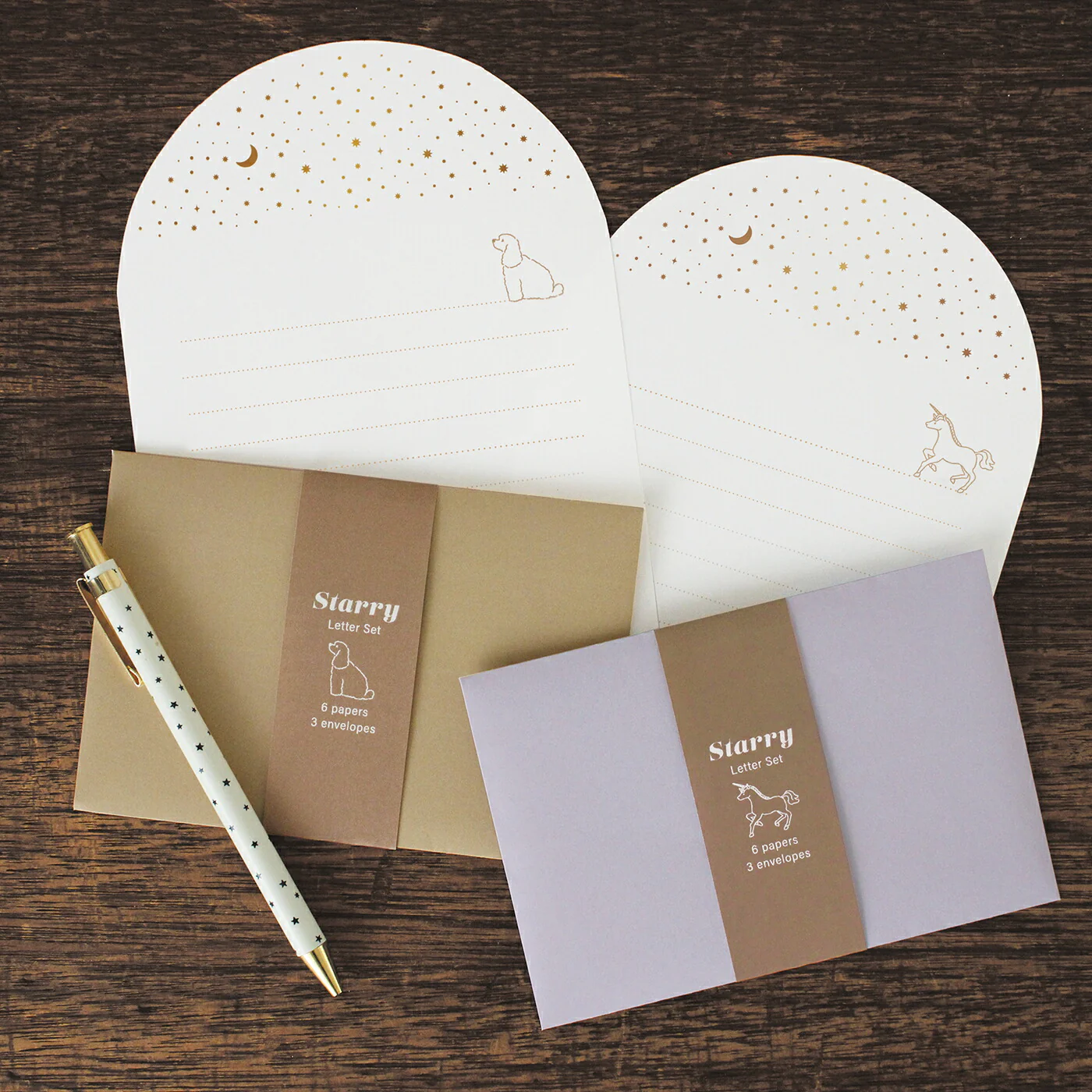 The dome-shaped letter paper is decorated with gold foil stamping to depict a sky full of sparkling stars.