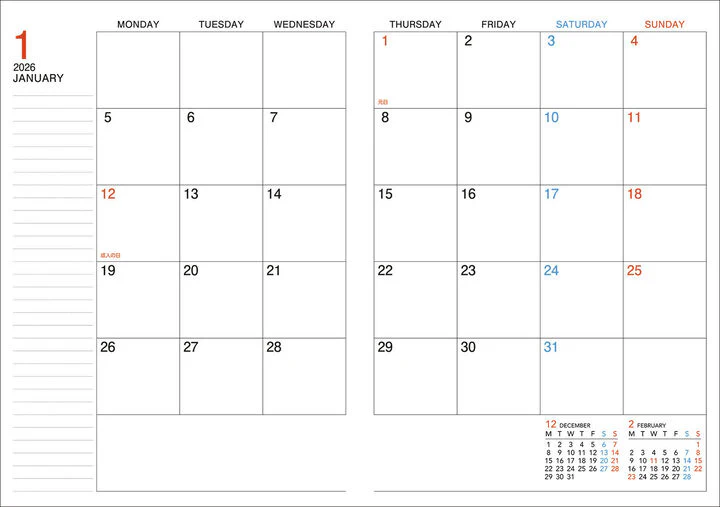 It features a two-page, one-month block layout, so you can see the whole month at a glance.