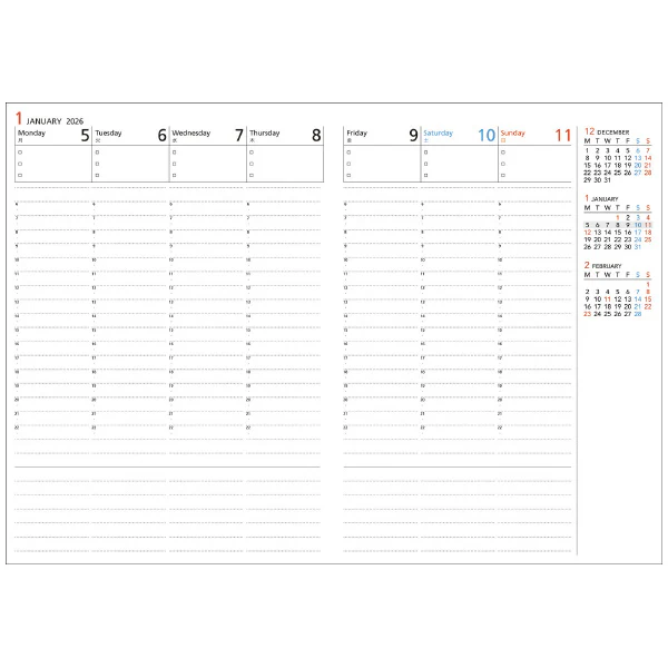 Annual calendar, annual planner, weekly schedule (one double-page spread for one week + timeline), horizontal rules (28 lines), weekly vertical.