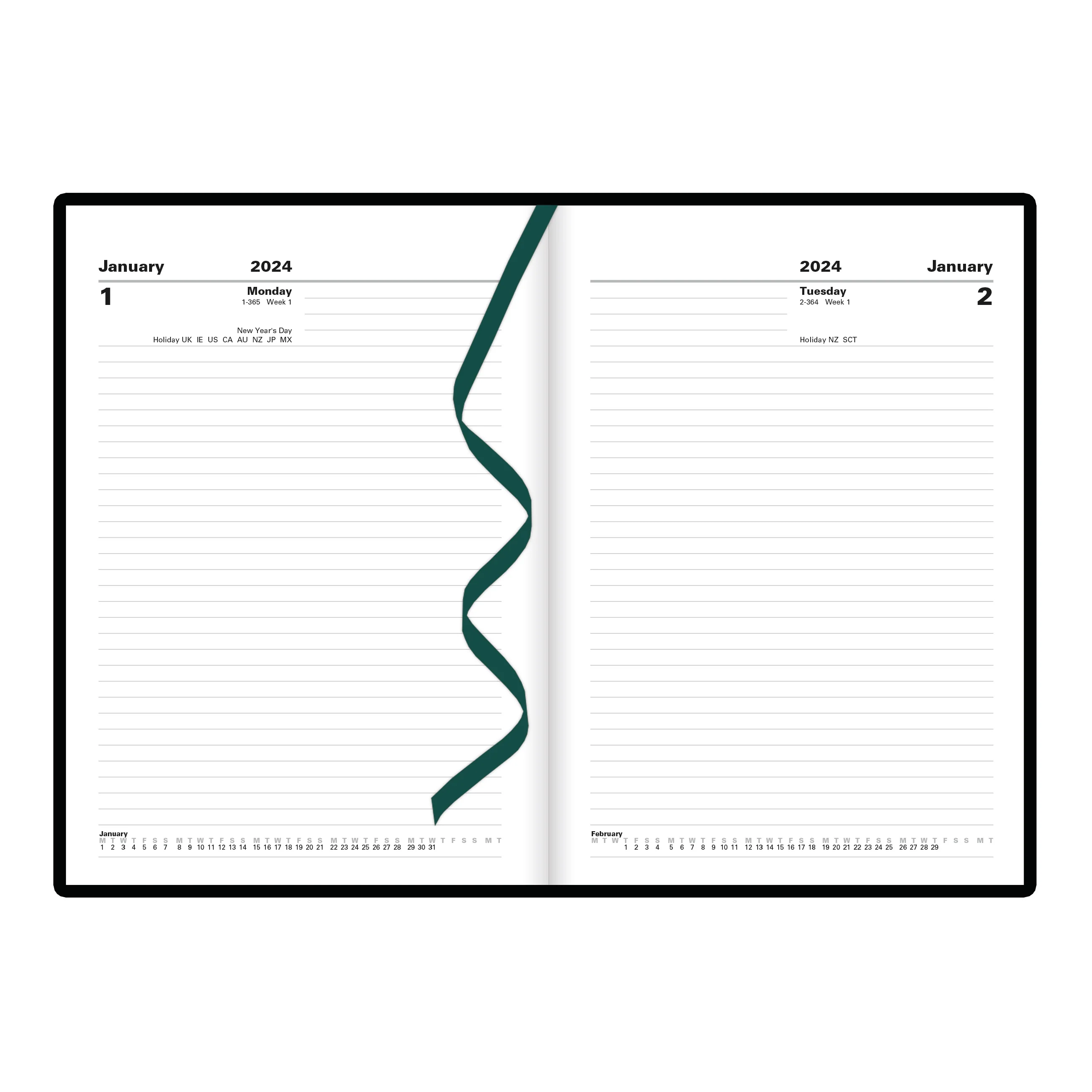 A classic hardback diary with leather-look finish and deluxe foil embossing. Features day per page diary with feint ruled areas for entries. Includes calendars of current and followings months on each spread to plan future tasks. Includes a ribbon bookmark, a monthly expense section, ruled notes section, personal information, holiday symbols, national holidays, religious festivals, conversion tables and many more.