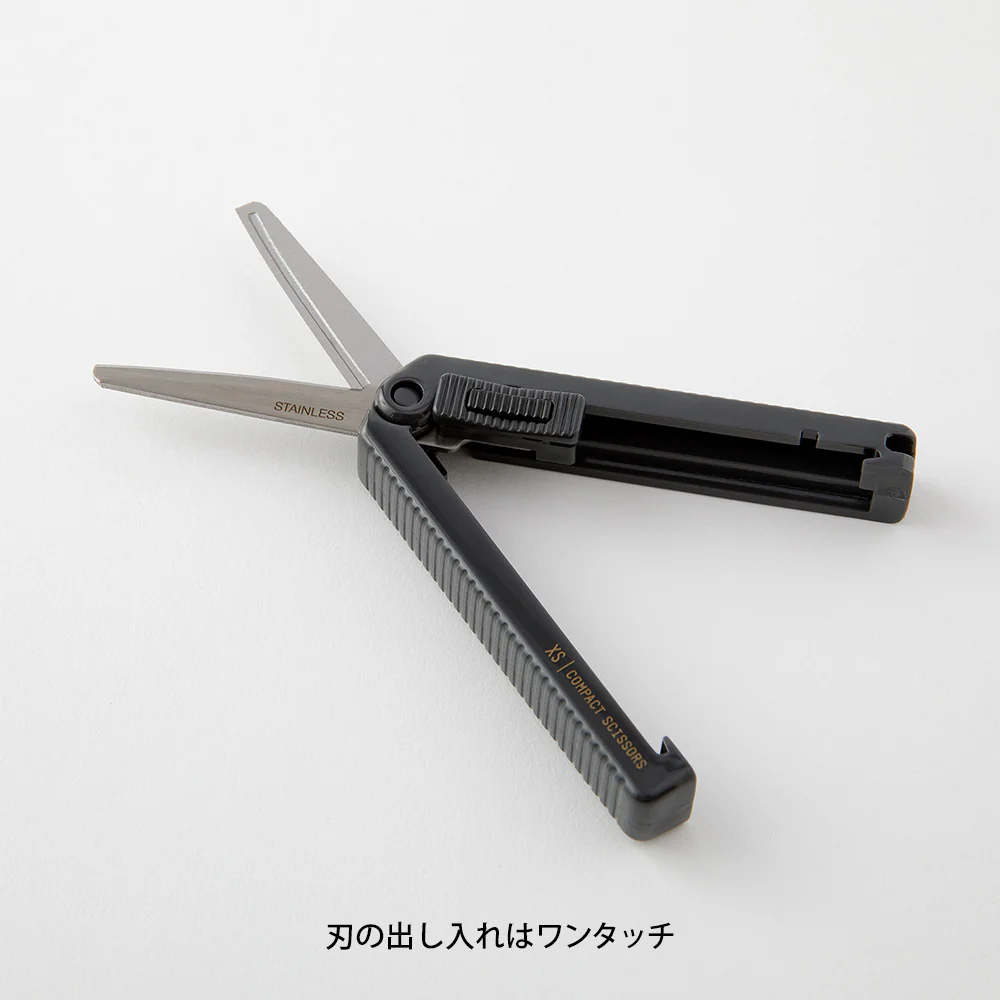 The XS series, bearing the name "Extra Small". This pair of scissors is extra small and highly functional. The blades are resistant to glue adhesion and can cut through thick paper. Slide the blade away to reduce the overall length to only 76 mm. You can carry them in your pocket with peace of mind.