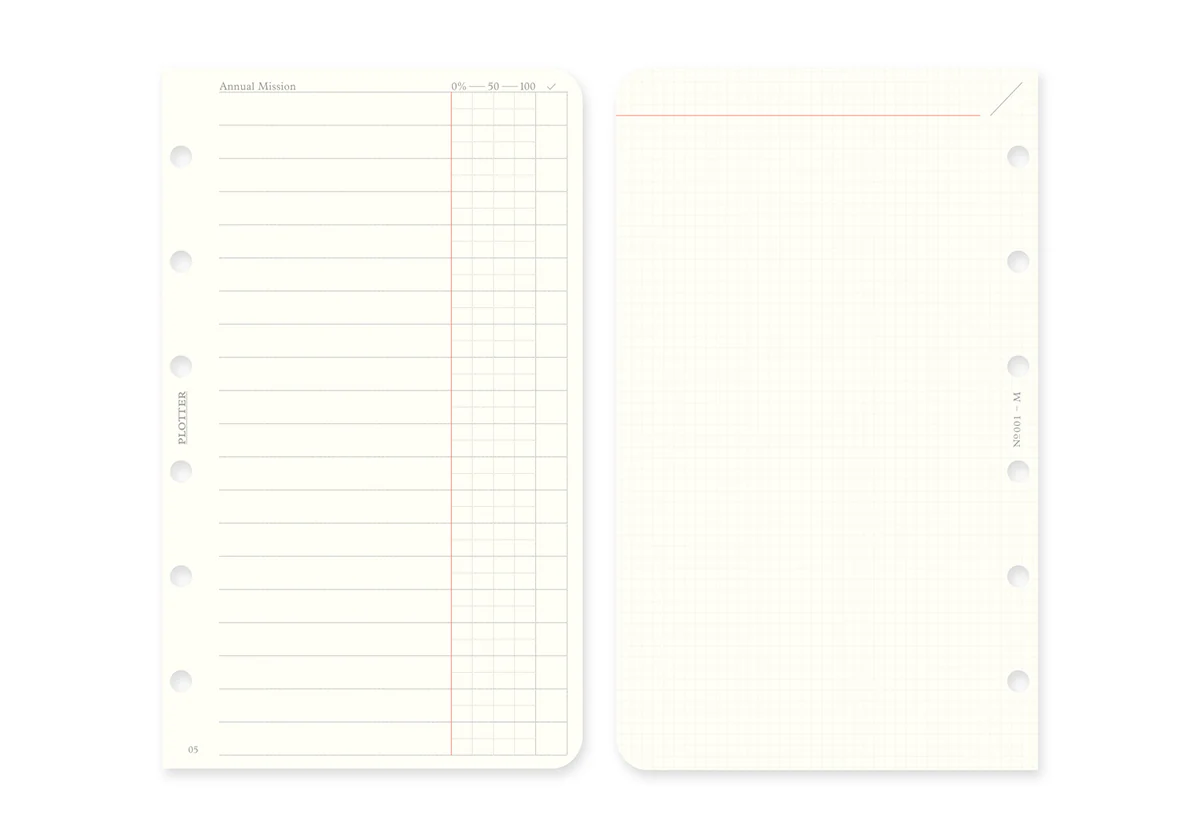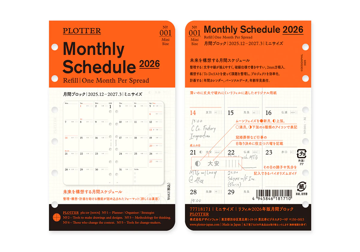 The dated Monthly Schedule Refill is meticulously designed to maximize the use of limited space and to provide a dated planner functionality to your PLOTTER Leather Binder Mini Size. It includes a monthly schedule at a glance, while the margin provides space to note down tasks or to-do lists.