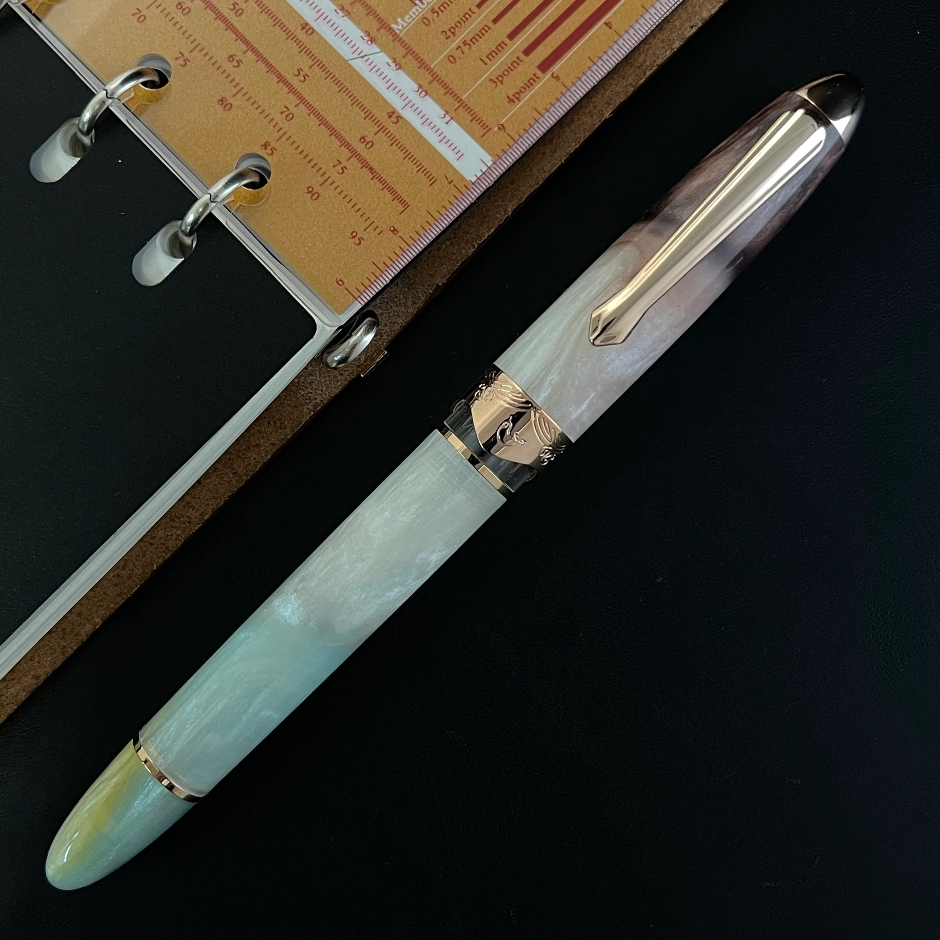 The Horizon collection draws inspiration from the view of the Horizon at different times of the day or under different natural phenomenon. Each pen is made from a uniquely hand-crafted piece of resin that beautifully fades between captivating colors that were meticulously picked. The Horizon collection brings a creative modern twist to the classic cigar shape. With its curved metal ring, representing the waves of the ocean, and Nahvalur’s signature ink window, representing the sky behind the waves, the collection strives for the perfect balance between modern creativity and cherished classic. A Twist of Classic.