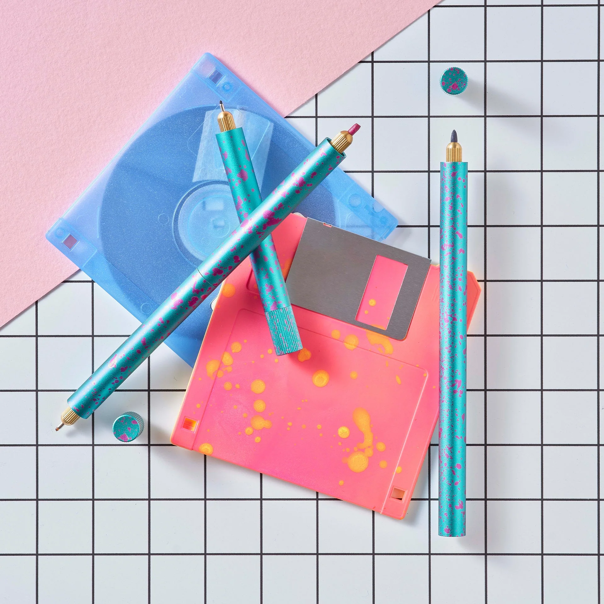 Each pen features a vibrant two-tone body with paint-splatter detailing. Available in three eye-catching colorways: